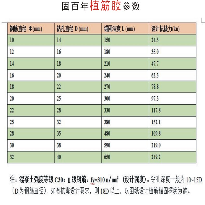 產(chǎn)品介紹:“固百年”錨固用膠粘劑是雙組分改性環(huán)氧結(jié)構(gòu)膠,用其植鋼筋、螺桿等,使鋼筋、螺桿如同預(yù)埋,鋼筋、螺桿的強(qiáng)度可充分利用。